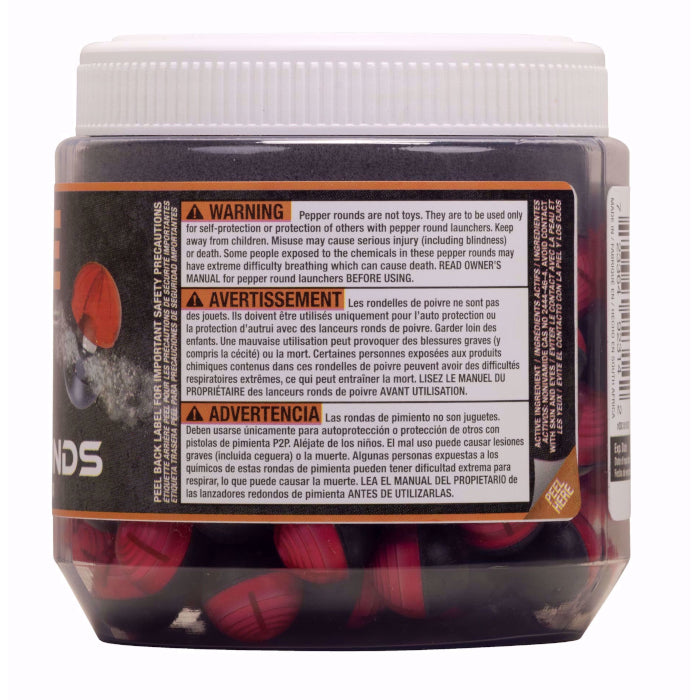 Las bolitas P2P Core Defense Pepper Rounds calibre .68 en presentación de 100 proyectiles están diseñadas para usuarios que requieren una mayor cantidad de municiones de defensa personal no letal dentro de la línea P2P (Prepared 2 Protect). Cada proyectil incorpora una carcasa frangible negro/rojo que contiene un núcleo de acero perfectamente centrado rodeado por polvo irritante PAVA al 7%.