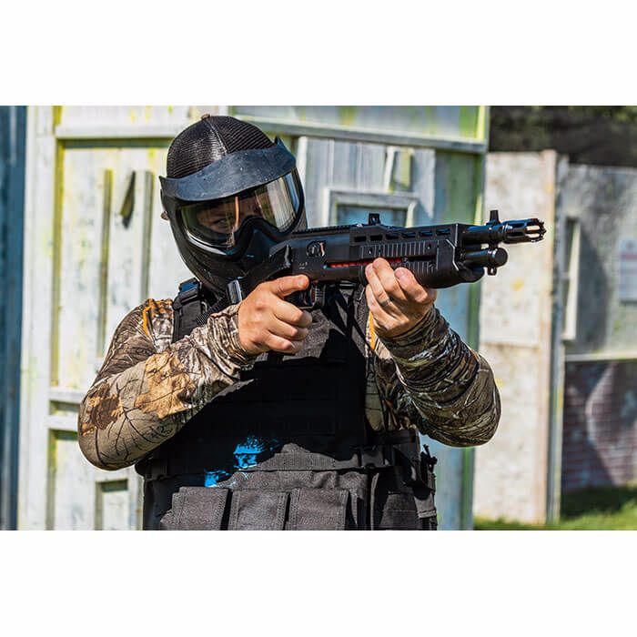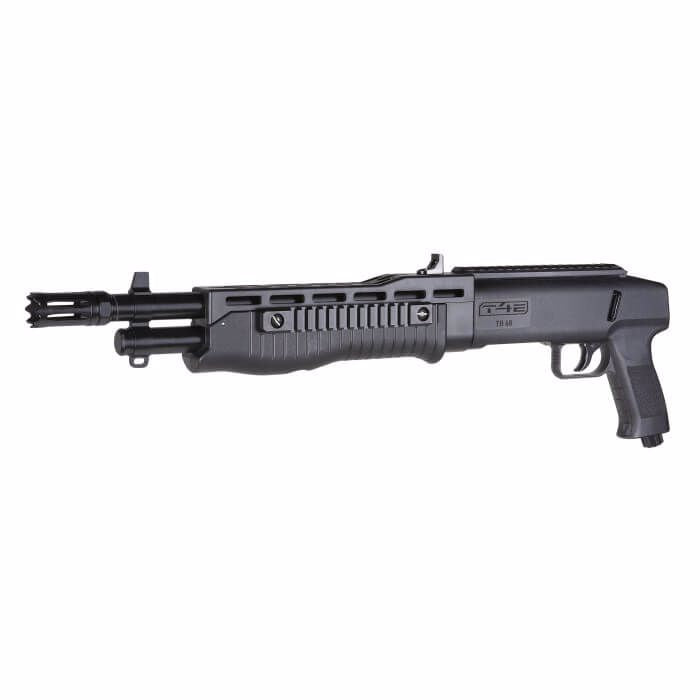 La escopeta de aire táctica marcadora T4E TB dispara bolas de goma (rubberball), de polvo (powderball) o de pintura (paintball) calibre .68, las cuales usan el mismo cargador.