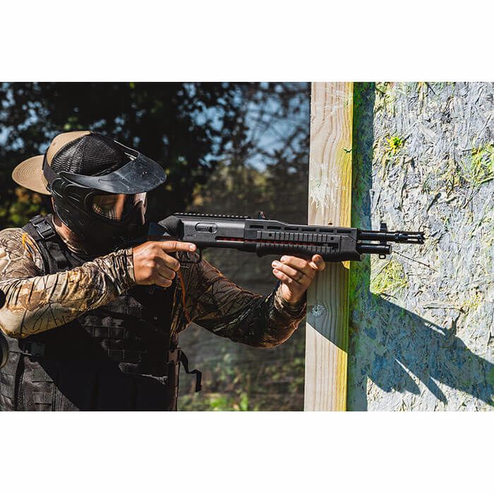 La escopeta de aire táctica marcadora T4E TX dispara bolas de goma (rubberball), de polvo (powderball) o de pintura (paintball) calibre .68, las cuales usan el mismo cargador.